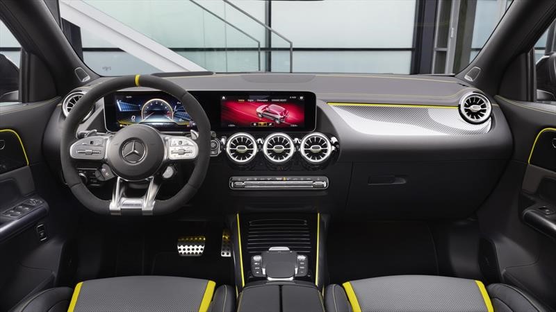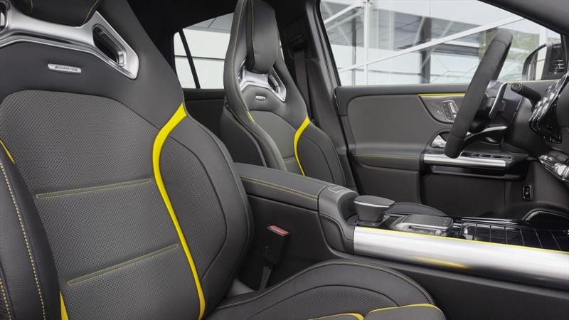 Adentro, el GLA 45 S 4Matic+ suma un alto grado de deportividad al lujo t tecnología que ofrece el GLA habitual. Asientos de cubo, volante forrado de gamuza, tapicerías de cuero y alcántara, y detalles de contraste se hacen presentes en este SUV deportivo.