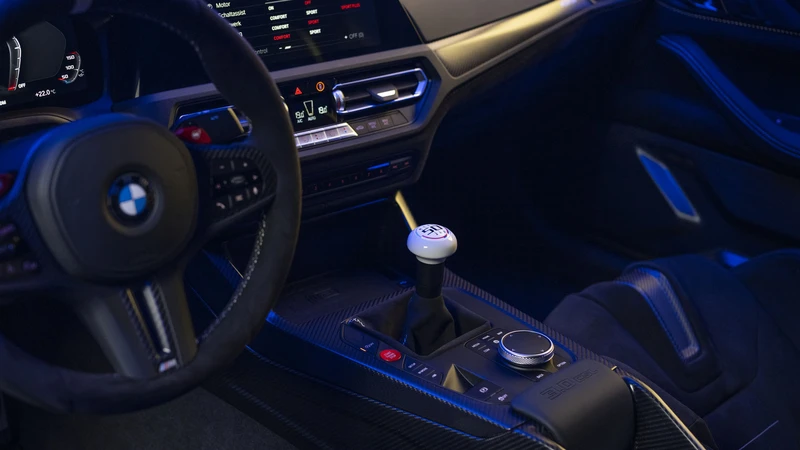 Para ahorrar peso, BMW redujo el aislamiento acústico, aunque mantiene la cabina digital. Otro toque especial es la palanca de la caja de cambios manual con estilo retro y en color blanco.